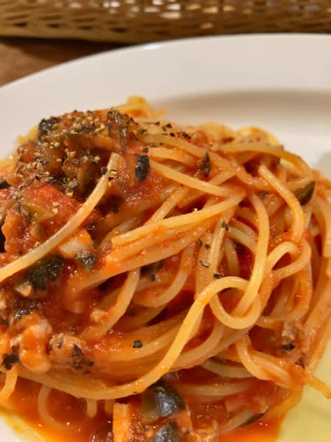 いいだことオリーブのラグートマトソーススパゲッティ&とうもろこしのリゾット